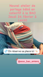 atelier portage collectif Quand 26 février 2026 14 h 30 min - 16 h 30 min Ajouter au Calendrier Télécharger ICS Calendrier Google iCalendar Office 365 Outlook Live Où ASSO BAO 419 rue de verdun, Amiens, SOMME, 80000, Hauts de france Carte non disponible On réserve sa place et on s’inscrit via Hello ans ICI