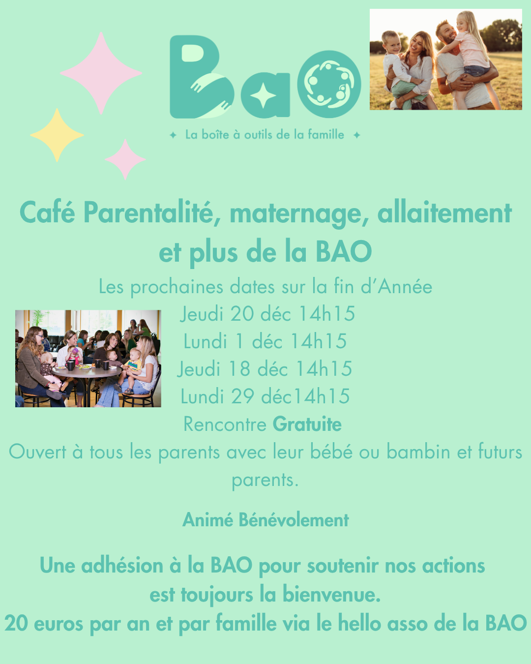 Café Maternage Allaitement et Parentalité Quand 1 décembre 2025 14 h 15 min - 16 h 00 min Ajouter au Calendrier Télécharger ICS Calendrier Google iCalendar Office 365 Outlook Live Où ASSO BAO 419 rue de verdun, Amiens, SOMME, 80000, Hauts de france Type d’évènement Atelier parents-enfants Carte non disponible Venez partager entre parents autour des sujets de la petites enfances, de nos victoires, nos doutes, nos questionnements entre parents